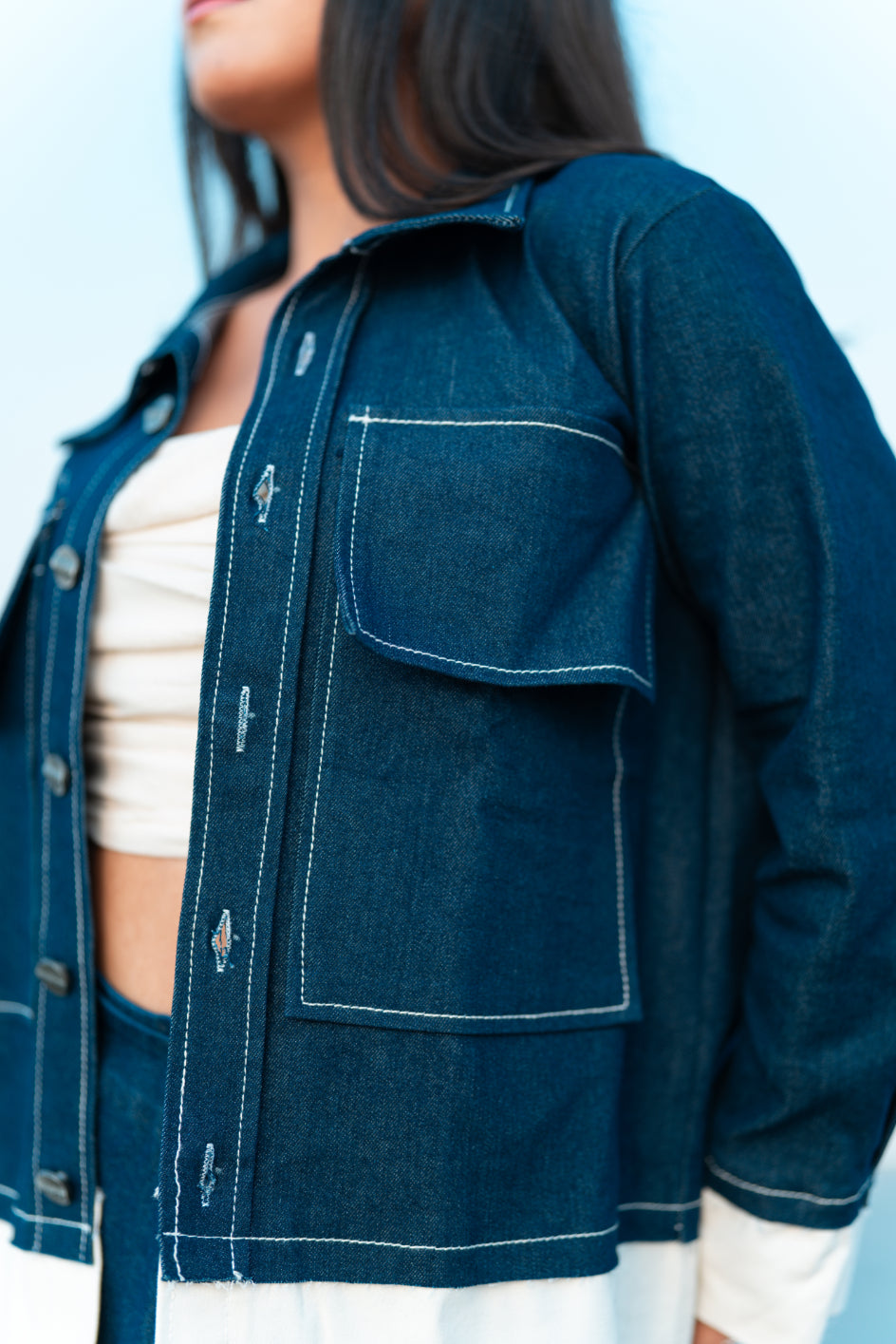 The boxy, full-sleeved jacket is cut in rich dark blue denim with crisp white contrast bands at the sleeve and waist hems.
