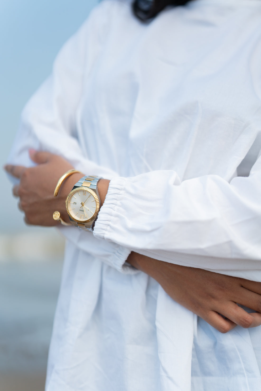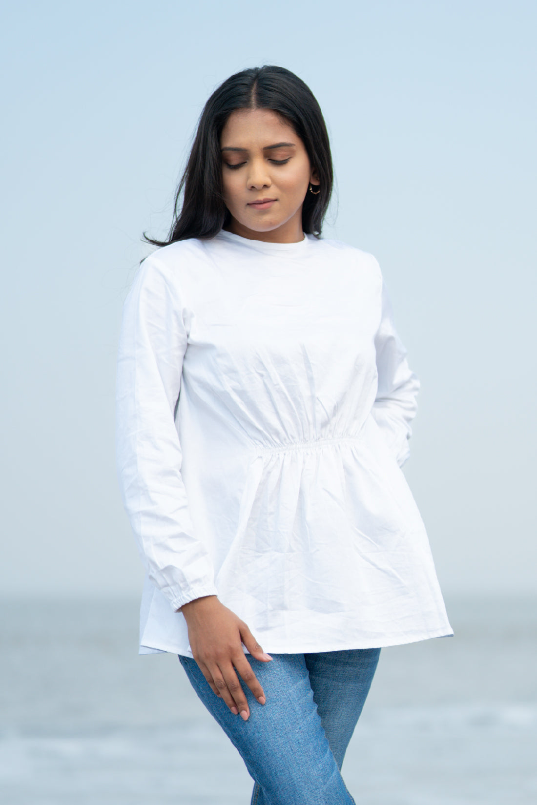 A long easy fit shirt with a soft cinch at the waist and wrist.