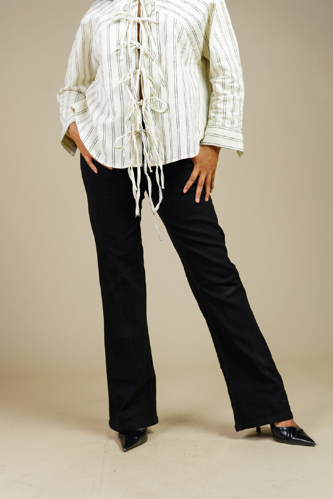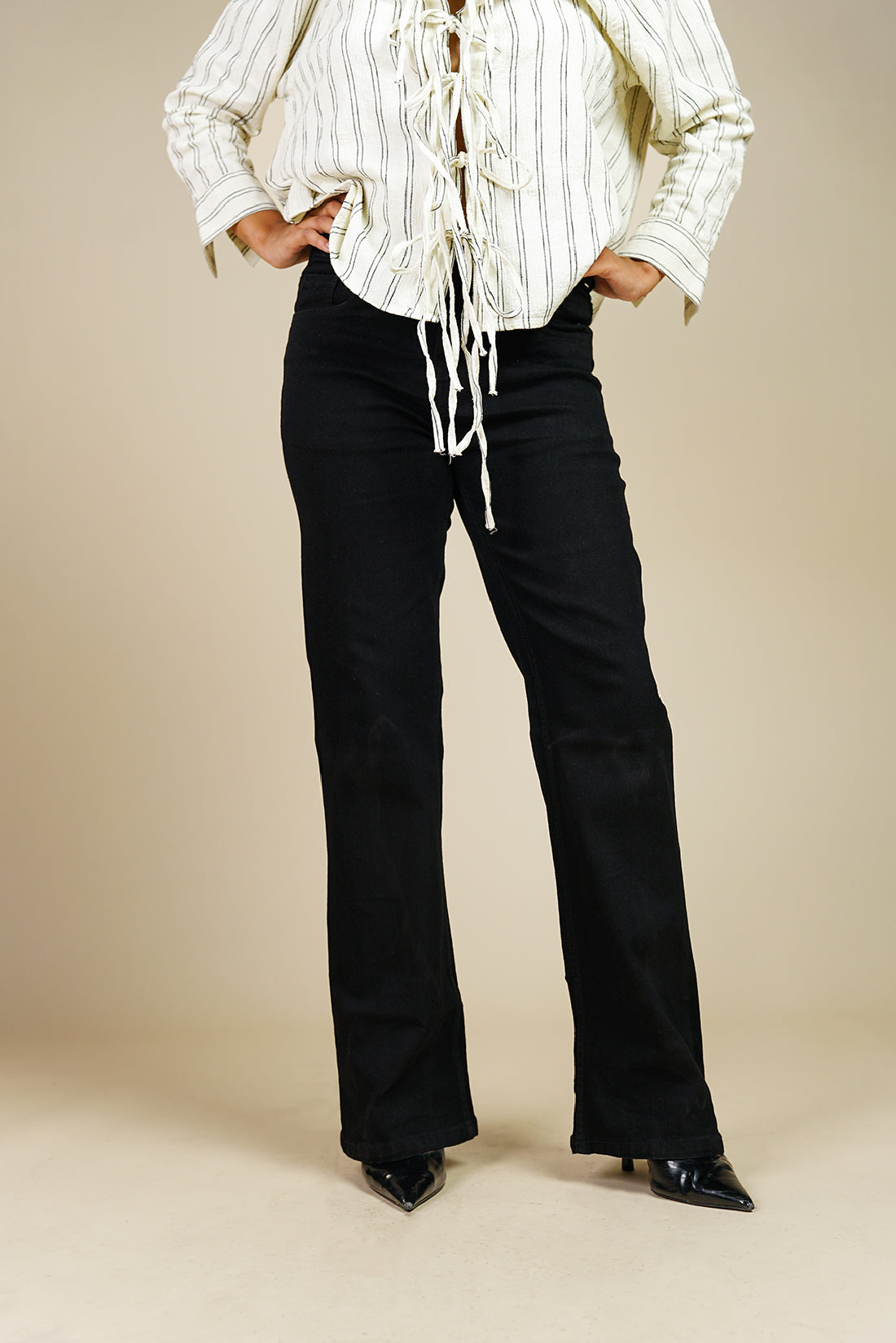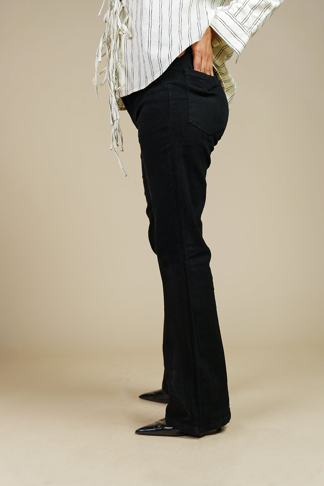 A flattering mid rise waist and a subtle flare that starts at the knee.