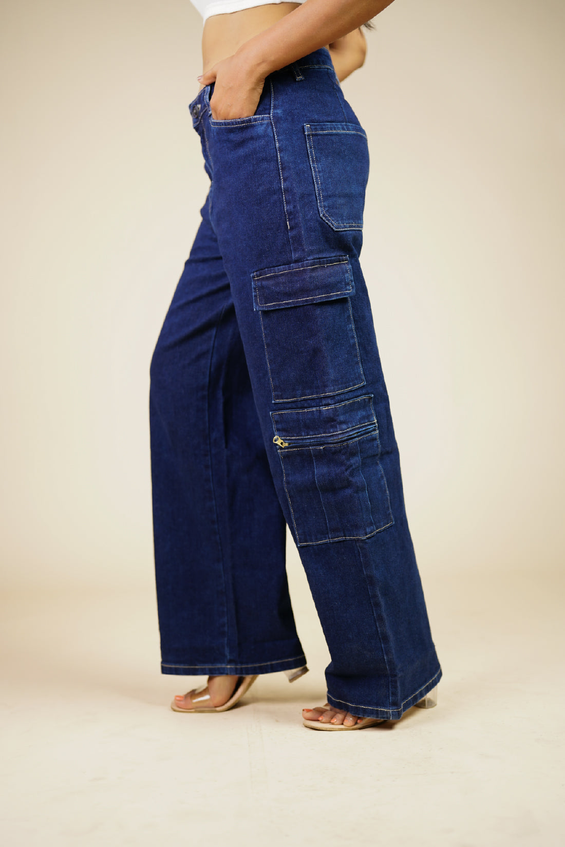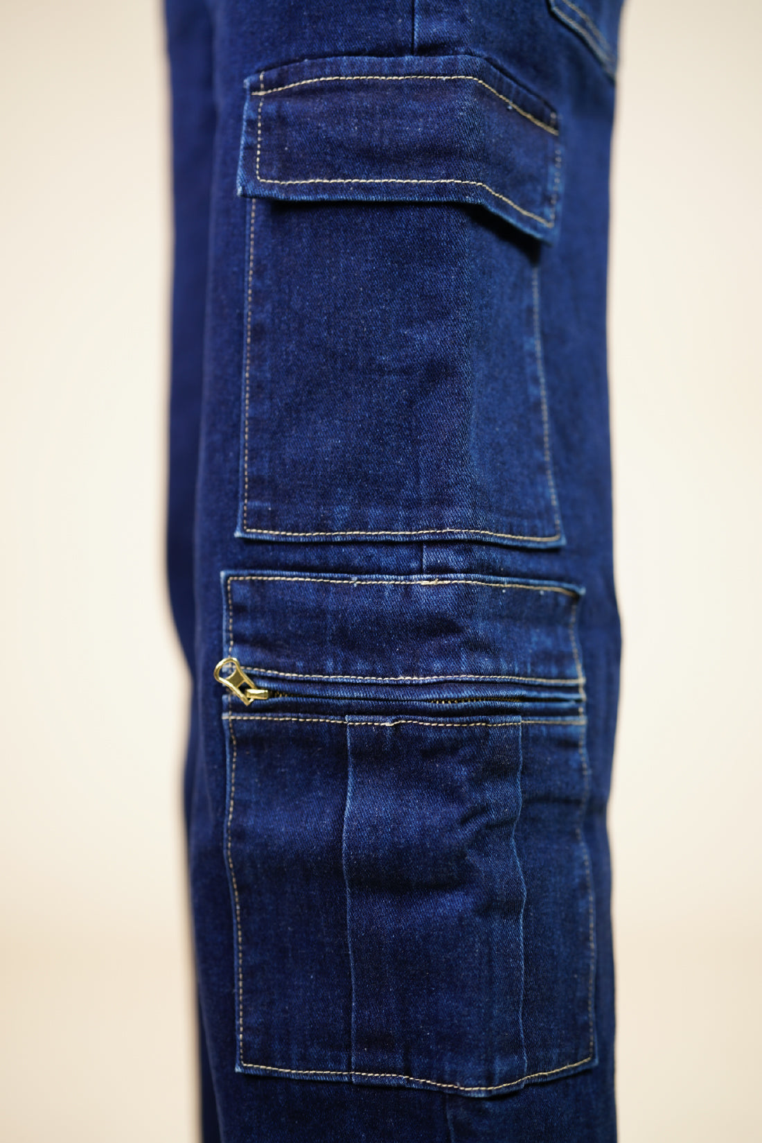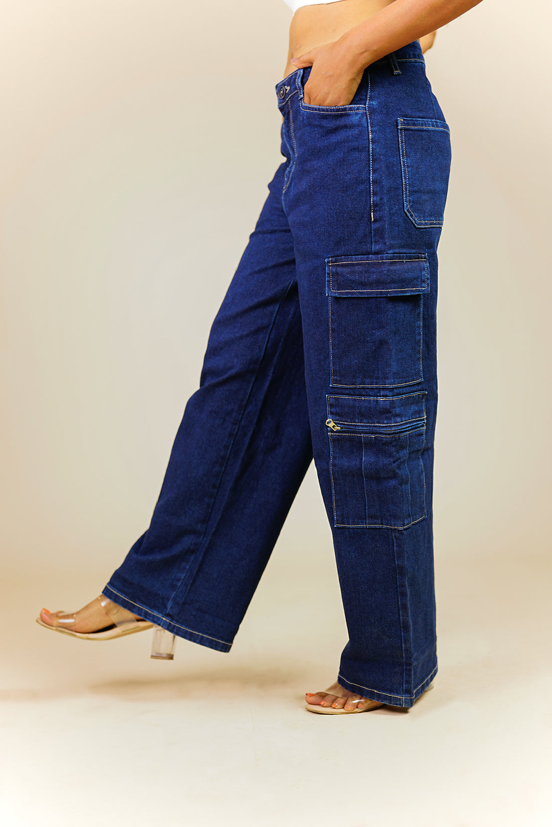 These mid-waist, straight leg jeans feature cargo style patch pockets with zipper detailing.