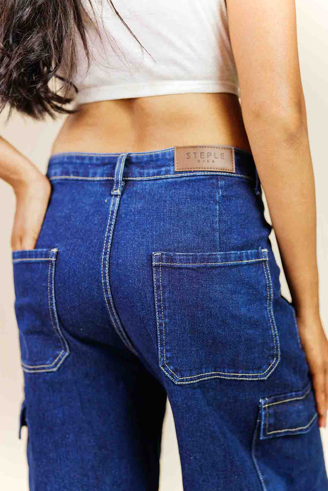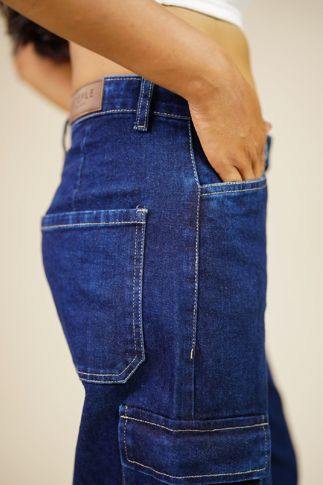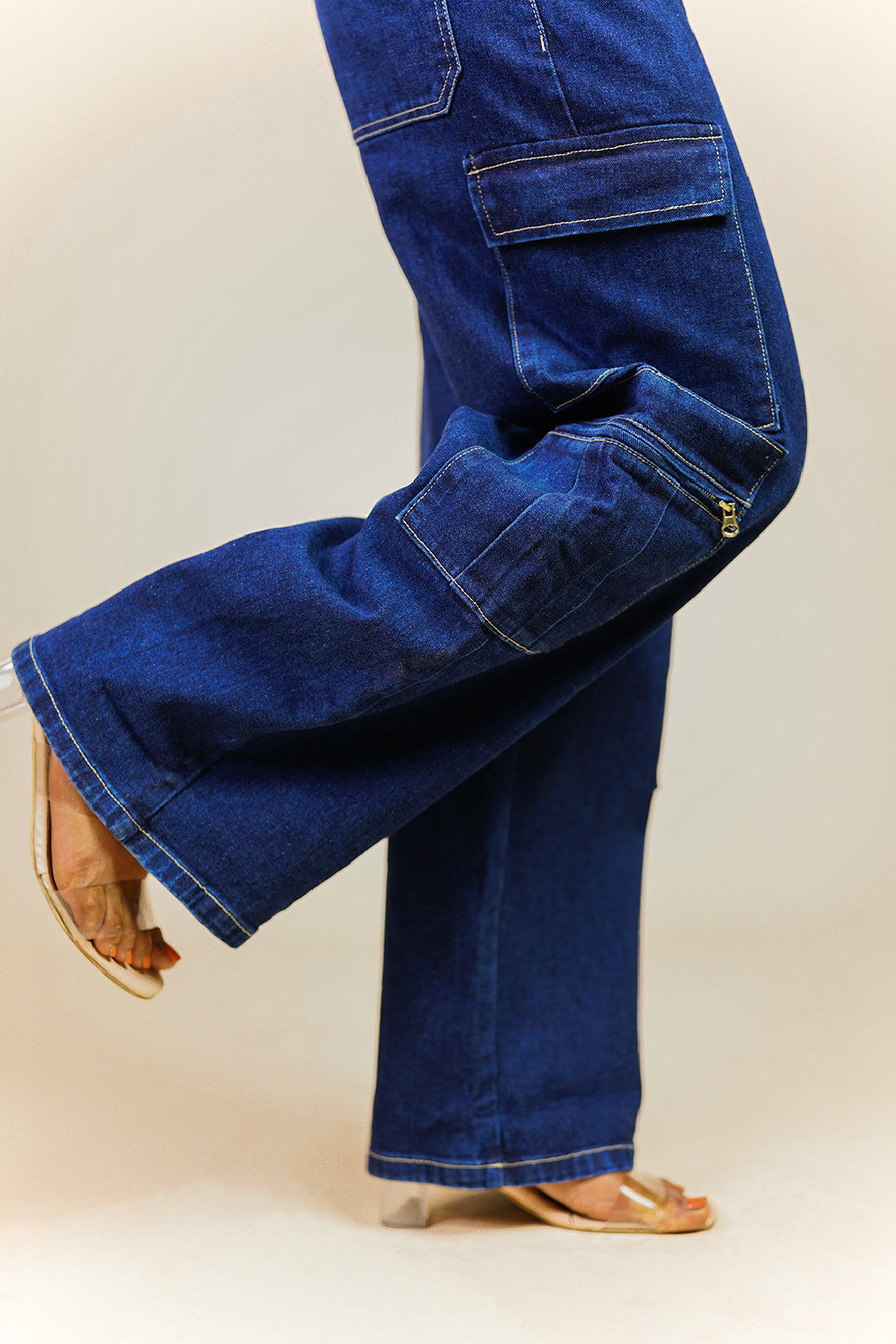 These mid-waist, straight leg jeans feature cargo style patch pockets with zipper detailing.