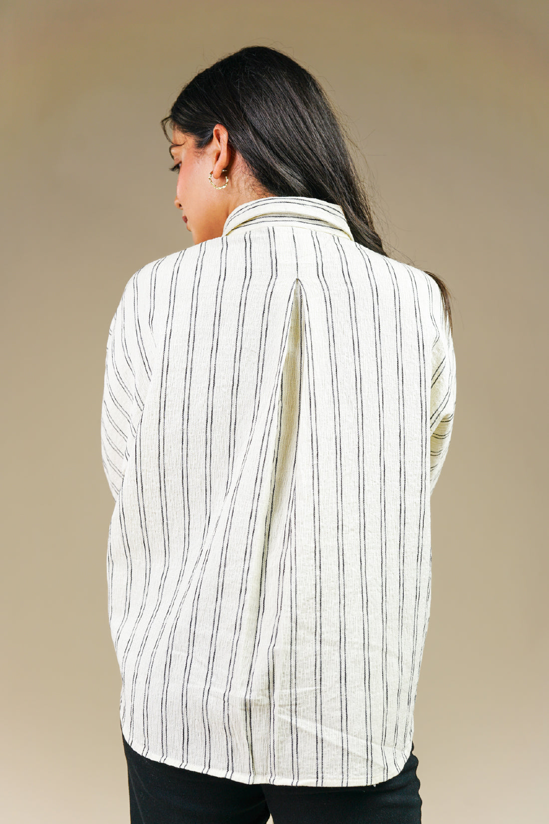 A fresh spin on everyday shirts - an all drawstring shirt crafted in textured cotton with fine stripes on a warm cream base.